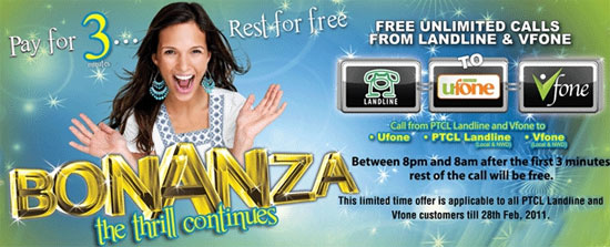 PTCL in Dec-Jan 2010-11 introduced a New Year special package called PTCL Bonanza. All calls from PTCL and Vfone to PTCL,Vfone & Ufone were free after the first 3 minutes from 8pm to 8am. The offer was for limited time, till 31st Jan. 2011, but now PTCL has decided to extend it for another month till February 2011.