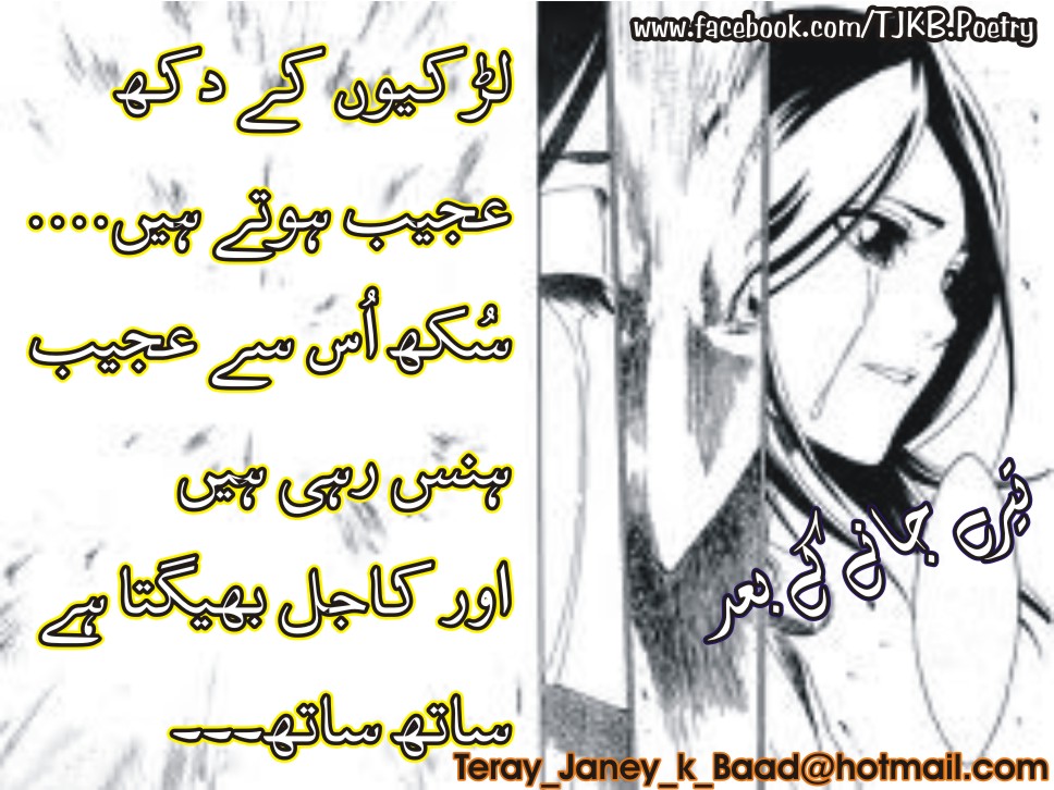 Larkiyon k Dukh. Ajeeb Hotey Hain…. Sukh Aus Say Ajeeb. Hans Rahi Hain. Aur Kajal Beghta Hai. Sath Sath… Reply