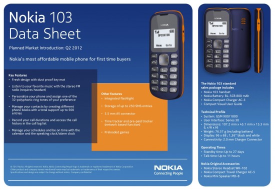 Price of Nokia 103 is Rs.1500 in Pakistan which makes it the most cheapest and affordable mobile phone. No doubt, by doing so, Nokia is going to get their graphs rising again from the Pakistani market. Nokia believe that there are still over 3billion people who are not even using a mobile phone. So the low-cost mobile phones will be in the reach of poor man also, as mobile phone is becoming an essential part of our daily lives. Nokia claims that this is the most affordable handset by Nokia ever and is the best for the first time buyers. In Pakistan, I’m sure a lot of babies who like to play with mobile phones are going to get this as a toy and will be fascinated with the ringtones and flash light. The price of Nokia 103 is Rs.1500 (€13) in Pakistan.