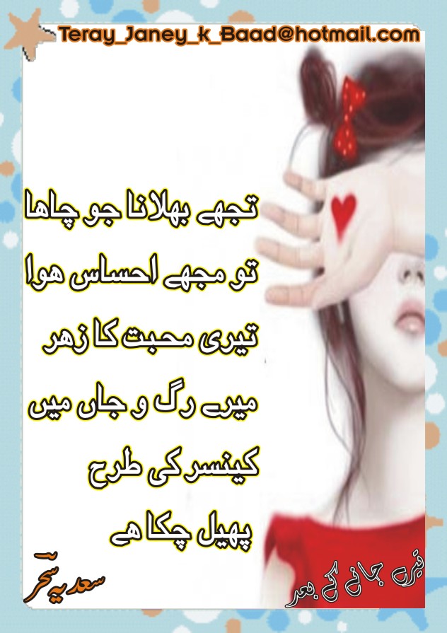 February 8, 2011 Tujey Bhulna Jo Chaha Poet: Sadia Saher Tujey Bhulana Jo Chaha Tu Mujey Ehsas Hoa Teri Mohabbat ka Zehar Meray Raag o Jaan Main Cancer ki Teran Phail Chuka Hai…